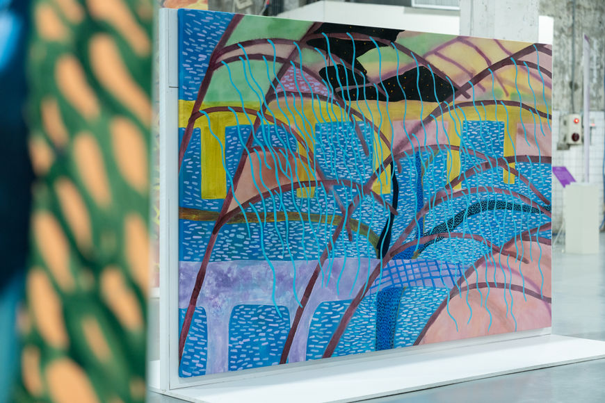 His vibrant, puzzle-like compositions feature distorted, cartoonish figures and bold patterns. Deconstructing form and space with playful precision, Ruckhäberle invites viewers to create their own narratives within his fragmented scenes.